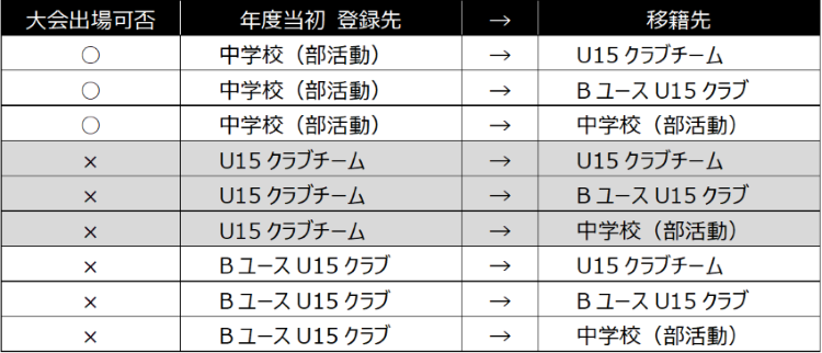 (1)2026年度において、都道府県バスケットボール協会を経て、公益財団法人日本バスケットボール協会U15カテゴリーに登録されたチームおよび競技者であること。 ※登録チーム内で、複数チームを編成して大会にエントリーすることは不可とする。 (2)選手の年齢は、2011年(平成23年)4月2日から2016年(平成28年)4月1日までに生まれた者とする。 (3)選手は年度当初に当該都道府県協会が定める期日までに登録したチームで出場するものとし、年度中に移籍(登録チームの変更)した場合、本大会に出場することはできない。 但し、年度当初に「中学校(部活動)」で登録された中学校3年生の選手に限り、年度内1回を上限に、2026年8月31日(月)までに移籍手続きが完了している場合には出場を認める。 <中学校3年生の移籍における全国U15選手権大会への出場許諾基準> ※本出場許諾基準は全国U15選手権大会(予選会を含む)に限り、適用する。 ※本出場許諾基準は2027年度大会までの適用とし、2028年度以降は適用しない。 2028年度以降、年度中に移籍した選手は、全国U15選手権大会(予選会を含む)に出場することはできない。 (4)同一年度での出場は、都道府県予選会・本戦ともに1回ずつとし、複数の都道府県で出場することはできない。 (5)推薦大会(全国中学校体育大会予選、U15クラブチーム大会など)に出場する選手は、大会に 出場するチームで競技者登録がされていることとする。 また、中学校2年生以下の選手で、年度当初に「中学校(中体連加盟チーム)」で競技者登録がなく、全国中学校体育大会(予選会を含む)に出場した場合は、JBA登録の有無にかかわらず、全国U15選手権大会(予選会を含む)に出場することはできない。なお、中学校3年生の選手についても同様の扱いとする。 ※推薦する都道府県協会において、2025年3月27日付JBA文書「U15カテゴリー中期方針2025における対応について」は、2025年度大会までの適用とし、2026年度以降は適用しない。 (6)2014年(平成26年)4月2日から2016年(平成28年)4月1日に生まれた者を選手として大会エントリーする場合は、1チームあたり2名までとする。(クラブ・Bユースのみ) (7)外国籍選手(JBA基本規程に基づく)の大会エントリーは、1チームあたり2名までとし、コート上の5名のうち1名以内とする。 なお、2026年度入学した外国籍選手は、下記の要件を満たしていること。 ・親権者の仕事の都合等により、日本に滞在をしている者(親権者および当該選手において、就労ビザおよび家族ビザが発給されている者) ・難民等により日本に滞在をせざるを得ない者 ※2028年度以降は、本大会に出場するすべての若年層外国籍選手に上記要件を適用する。 (8)ベンチで指揮を執るコーチはJBA公認D級コーチ以上を保有していること。 但し、Bユース(U15)においては、BリーグのU15チーム規程に準ずる。 (9)チーム責任者は、年齢が2026年4月1日時点で20歳以上の者で、チームを代表して対外的な窓口となり、参加にかかる手続き等ができること。また、チームに帯同し、チームの最終責任者として活動できる者であること。 ダウンロード ○ [資料]2026年度第7回全国U15バスケットボール選手権大会 出場要件「参加資格」について(2026年2月27日版)
