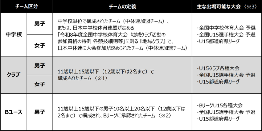 〈※1〉「中学校」、「Bユース」にあてはまらないチームは「クラブ」として登録可。 〈※2〉Bクラブが複数チームを保有している場合でも、Bリーグによって承認されるチームは1チームのみで、それ以外は「クラブ」登録となる。 〈※3〉大会参加には、別途、大会要項等に定められた要件を満たす必要がある。そのため、登録をする前に、各大会の出場要件(参加資格)を確認すること。