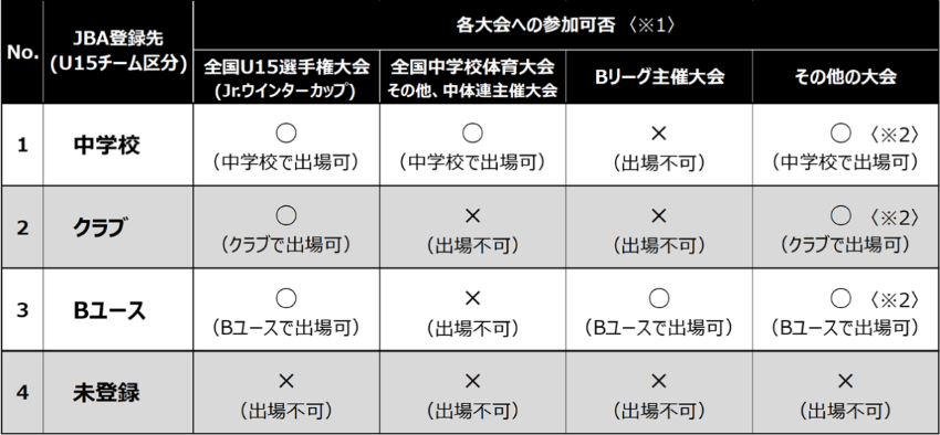 ○ 日本中学校体育連盟の決定により、2026年度(令和8年度)より、全国中学校体育大会(予選会を含む)に参加する選手は、「中学校(部活動)」で登録が必要です。なお、年度当初に「中学校(中体連加盟チーム)」で競技者登録がなく、全国中学校体育大会(予選会を含む)に出場した場合は、JBA登録の有無にかかわらず、全国U15選手権大会(予選会を含む)に出場することはできません。
